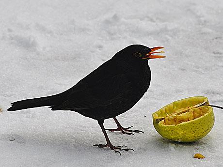 Amseln fressen gerne Obst wie Apfel- oder Birnenhälften.